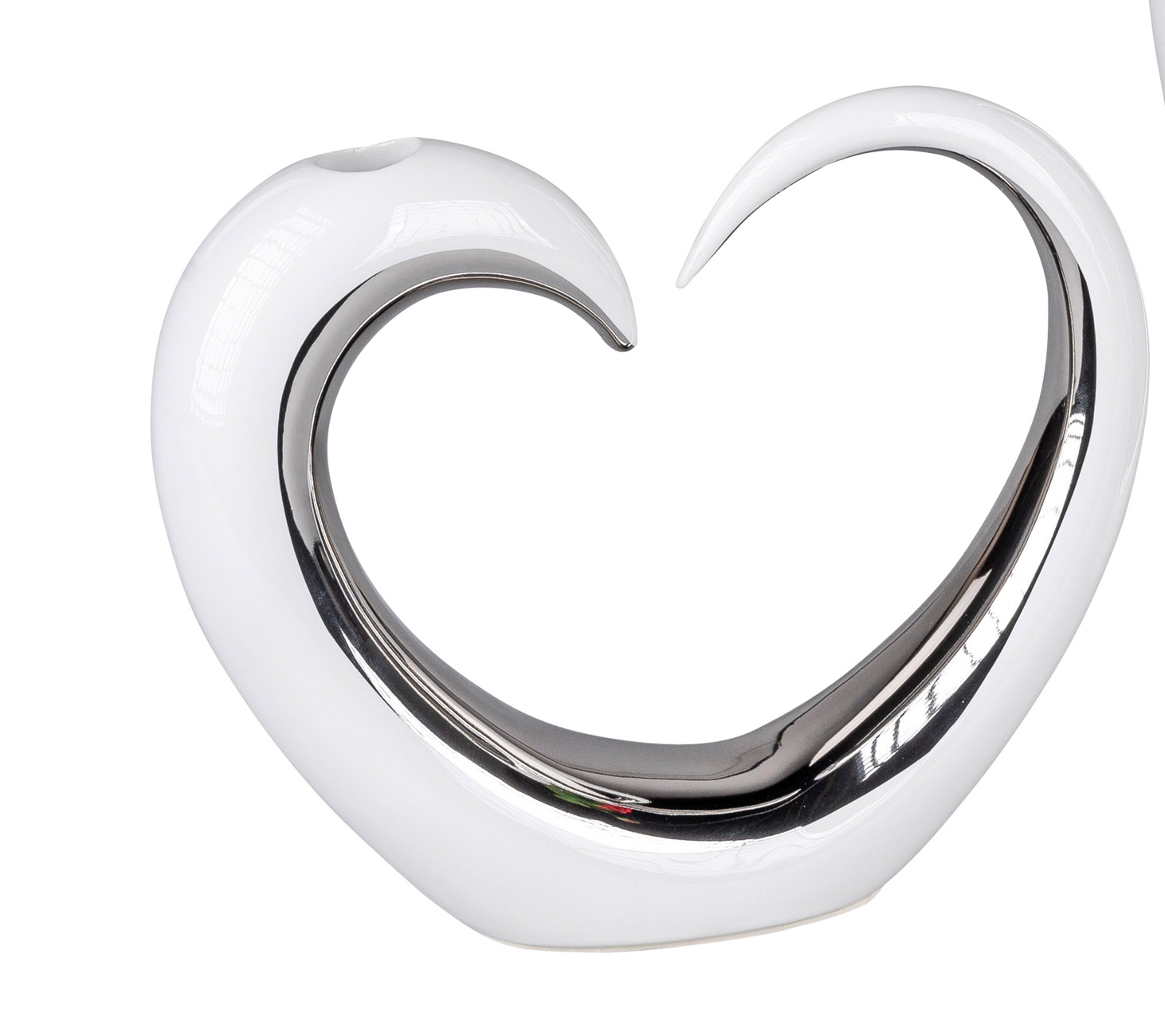 moderne Deko-Vase aus Keramik für eine Blume Tischvase Dekovase Herzvase Blumenvase Solifleurvase Dekoherz weiß silber 22x19cm